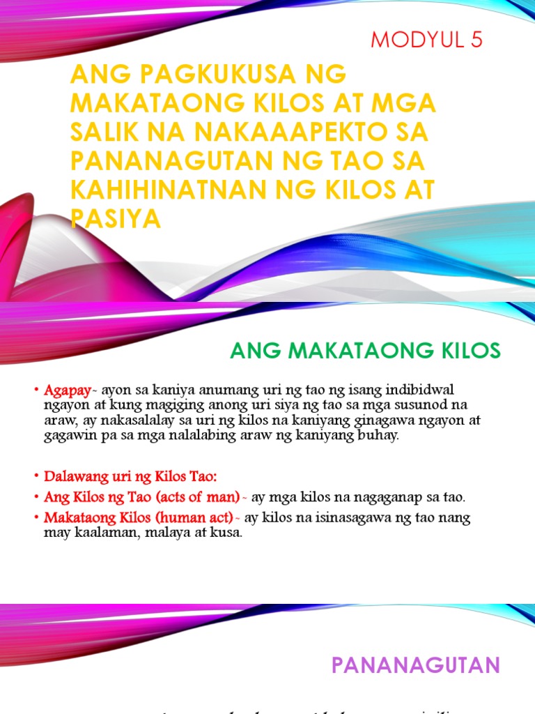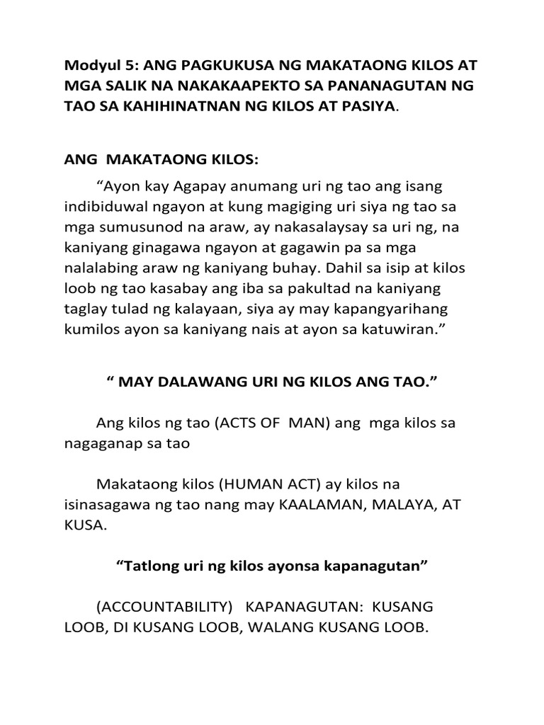Modyul 5 Ang Pagkukusa Ng Makataong Kilos At Mga Salik Na Nakaaapekto Sa Pananagutan Ng Tao Sa Kahihinatnan Ng Kilos At Pasiya Ang Makataong Kilos