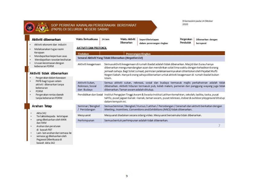 Majlis keselamatan negara negeri sabah mengeluarkan sop baru perintah kawalan pergerakan bersyarat pkpb yang telah dikemaskini 10 november 2020 bagi seluruh negeri sabah. Aktiviti dan protokol waktu berkuat kuasa 24 jam waktu aktiviti dibenarkan seperti ketetapan dalam penerangan ringkas pergerakan penduduk dibenarkan dengan bersyarat tindakan penerangan.