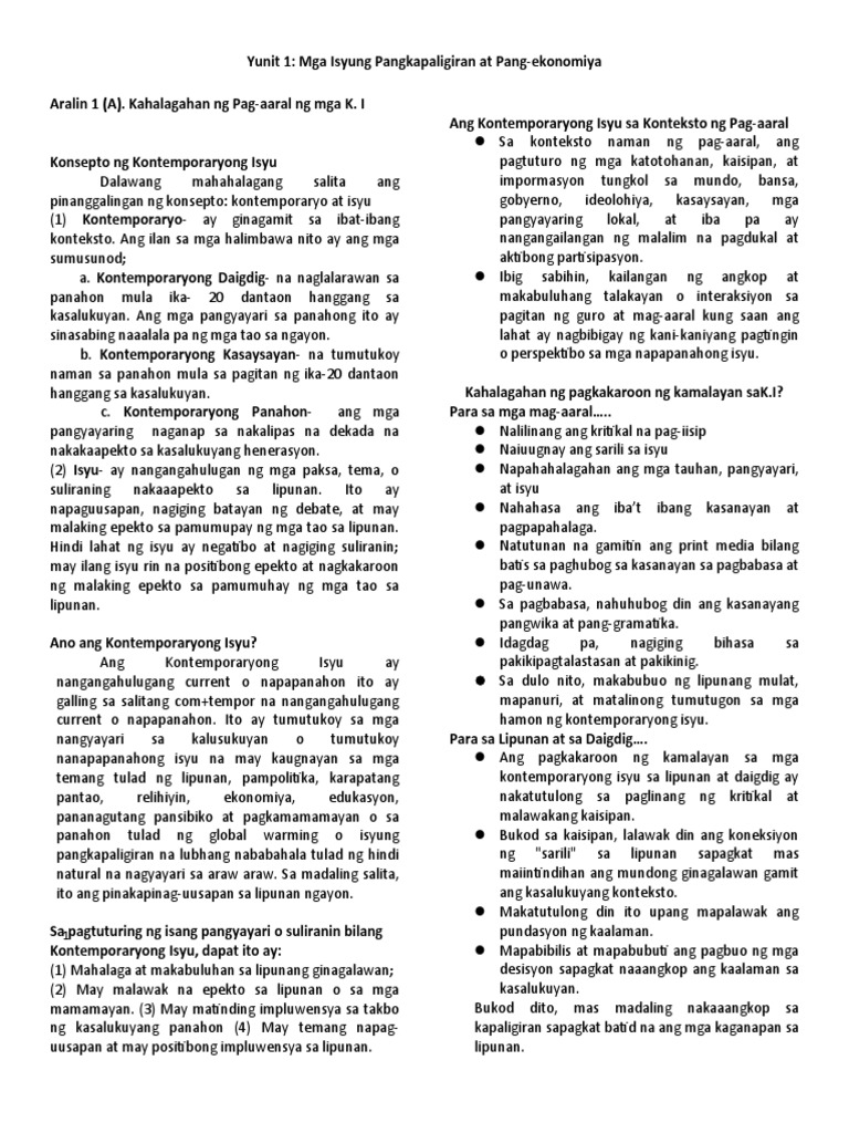 Yunit 1 Mga Isyung Pangkapaligiran At Pang Ekonomiya Docx
