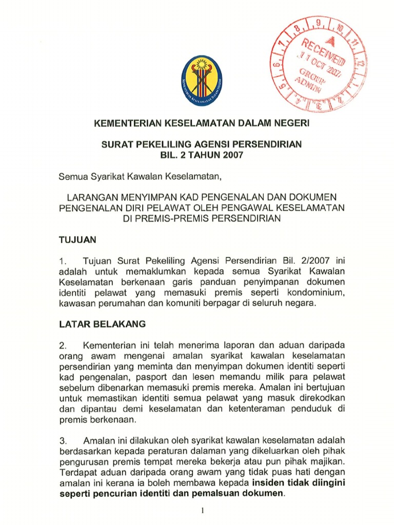 Kementerian Keselamatan Dalam Negeri Surat Pekeliling Agensi Persendirian Bil 2 Tahun 2007