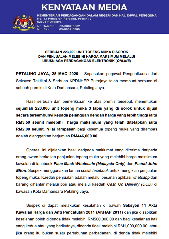 Kenyataan Media Kpdnhep Tindakan Tegas Kenaikan Harga Face Mask Jabatan Penerangan Malaysia