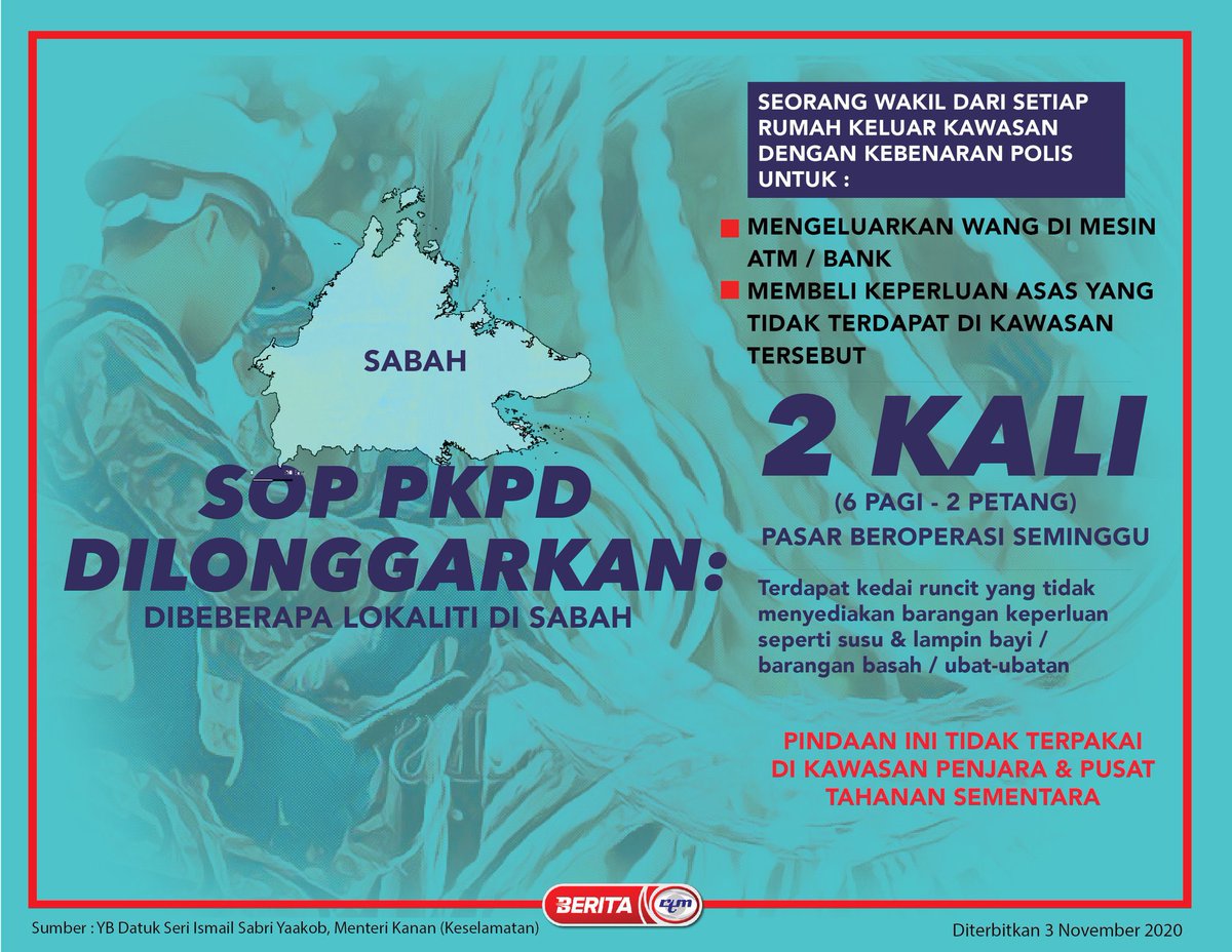 Menteri kanan kluster keselamatan datuk seri ismail sabri yaakob berkata arahan berkuat kuasa mulai 12 01 tengah malam ini akan membabitkan seramai 962 661 penduduk. Majlis keselamatan negara negeri sabah mengeluarkan sop baru perintah kawalan pergerakan bersyarat pkpb yang telah dikemaskini 10 november 2020 bagi seluruh negeri sabah.